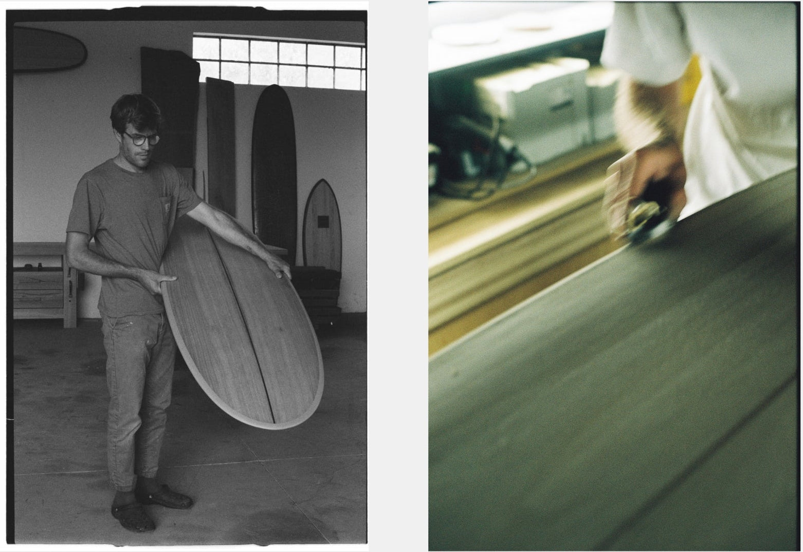 Wood is our main material, but we do still use fiberglass cloth and epoxy resin for the final lamination. This makes the board watertight and long-lasting, while keeping the resin content to a minimum, far less than what’s used in traditional foam boards. We’re constantly testing alternative, lower-impact finishes, but ocean conditions demand durability, which is also part of the ecological equation.